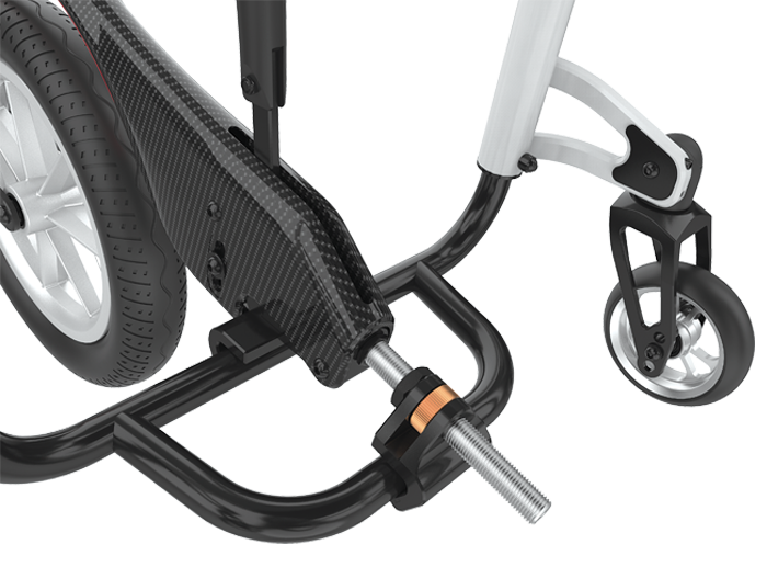Once this front wheel attachment has been correctly adjusted to fit your wheelchair, it can be attached and detached within seconds. The Track Wheel comes in two connecting systems: Single Arm with one clamping device and Double Arm with a double clamping device.